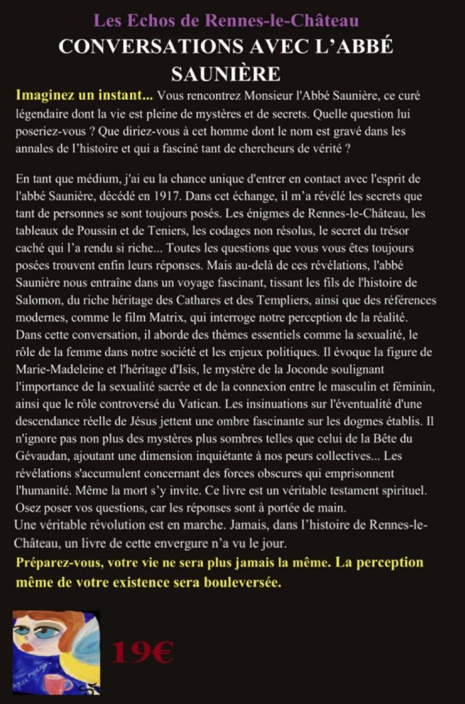 En tant que médium, j’ai eu la chance unique d’entrer en contact avec l’esprit de l’abbé Saunière, décédé en 1917. Dans cet échange, il m’a révélé les secrets que tant de personnes se sont toujours posés. Les énigmes de Rennes-le-Château, les tableaux de Poussin et de Teniers, les codages non résolus, le secret du trésor caché qui l’a rendu si riche… Toutes les questions que vous vous êtes toujours posées trouvent enfin leurs réponses. Mais au-delà de ces révélations, l’abbé Saunière nous entraîne dans un voyage fascinant, tissant les fils de l’histoire de Salomon, du riche héritage des Cathares et des Templiers, ainsi que des références modernes, comme le film Matrix, qui interroge notre perception de la réalité. Dans cette conversation, il aborde des thèmes essentiels comme la sexualité, le rôle de la femme dans notre société et les enjeux politiques. Il évoque la figure de Marie-Madeleine et l’héritage d’Isis, le mystère de la Joconde soulignant l’importance de la sexualité sacrée et de la connexion entre le masculin et féminin, ainsi que le rôle controversé du Vatican. Les insinuations sur l’éventualité d’une descendance réelle de Jésus jettent une ombre fascinante sur les dogmes établis. Il n’ignore pas non plus des mystères plus sombres telles que celui de la Bête du Gévaudan, ajoutant une dimension inquiétante à nos peurs collectives… Les révélations s’accumulent concernant des forces obscures qui emprisonnent l’humanité. Même la mort s’y invite. Ce livre est un véritable testament spirituel. Osez poser vos questions, car les réponses sont à portée de main.